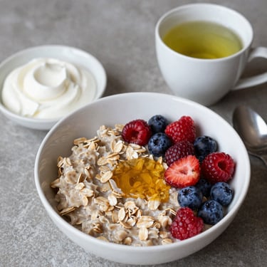 Breakfast: Start the day with a wholesome breakfast by enjoying an oatmeal bowl topped with fresh berries and a tablespoon of honey. Accompany this meal with a side of Greek yogurt for added protein, enhancing satiety and nutritional value. A cup of green tea serves as a refreshing, hydrating option, rich in antioxidants.